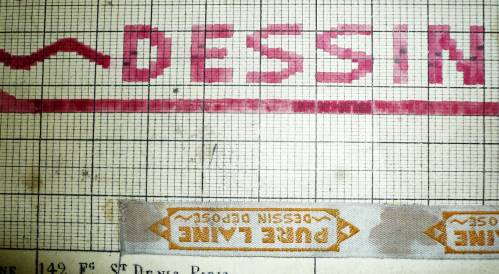 Dessin de mise en carte pour ruban jacquard comportant, en rouge et noir sur fond blanc, l’inscription sur deux lignes : “PURE LAINE; DESSIN DEPOSE”.
