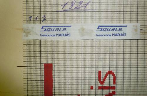 Dessin de mise en carte pour ruban jacquard comportant, en rouge et noir sur fond blanc, l’inscription sur deux lignes : “SQUALE; FABRICATION MARAIS”.