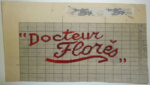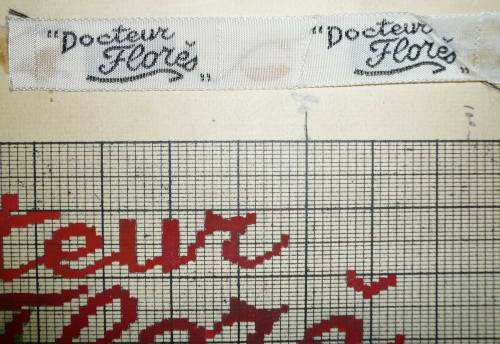 Dessin de mise en carte pour ruban jacquard comportant, en rouge et noir sur fond blanc, l’inscription sur deux lignes : “”Docteur; Florès””.