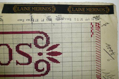 Dessin de mise en carte pour ruban jacquard comportant, en rouge et noir sur fond blanc, l’inscription inscrite dans un cartouche terminé de motifs en palmettes : “LAINE MERINOS”.