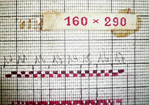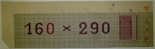 Dessin de mise en carte pour ruban jacquard comportant, en rouge et noir sur fond blanc, l’inscription : “160 x 290”.