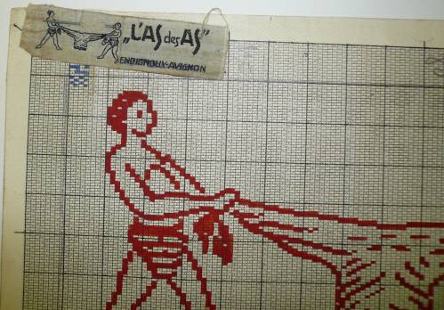 Dessin de mise en carte pour ruban jacquard comportant, en rouge, noir et bleu sur fond blanc, l’inscription sise à la droite d’un logo représentant deux hommes affrontés se disputant une pièce de tissu : “L’As des As”.