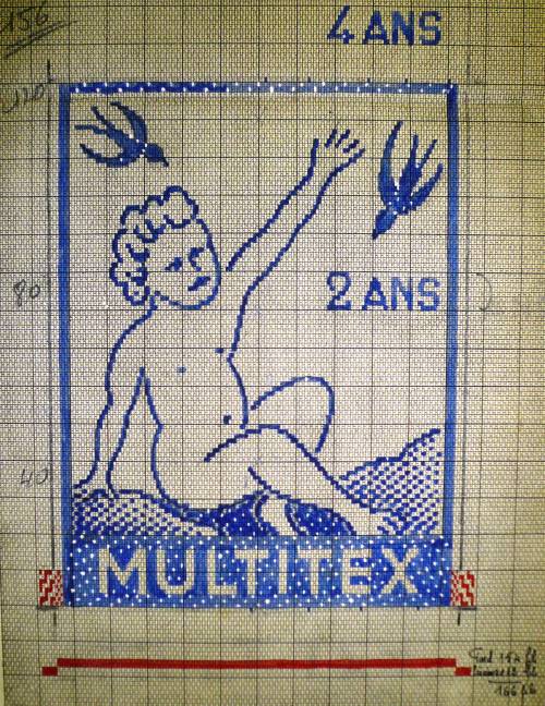 Dessin de mise en carte pour ruban jacquard comportant, en gris, rouge et bleu sur fond blanc, l’inscription sur huit lignes “1 AN; 16 ANS; 14 ANS; 12 ANS; 10 ANS; 8 ANS; 6 ANS; 4 ANS”, précédant un cartouche habité d’un motif avec petit garçon levant la main vers deux hirondelles et comportant les mentions sur deux lignes “2 ANS; MULTITEX” .