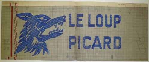 Dessin de mise en carte pour ruban jacquard comportant, en gris, rouge et bleu sur fond blanc, l’inscription sur deux lignes jouxtant l’effigie d’une tête de loup : “LE LOUP; PICARD”.