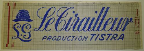 Dessin de mise en carte pour ruban jacquard comportant, en gris, rouge et bleu sur fond blanc, l’inscription sur trois lignes jouxtant l’effigie d’un chapeau : “L. G.; Le Tirailleur; PRODUCTION TISTRA”.