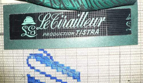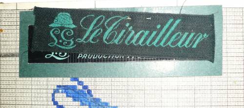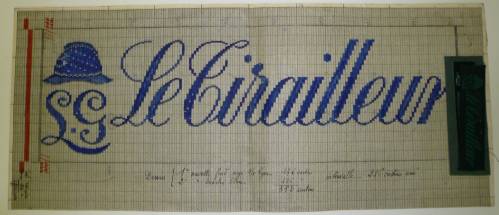 Dessin de mise en carte pour ruban jacquard comportant, en gris, noir, rouge et bleu sur fond blanc, l’inscription sur deux lignes jouxtant l’effigie d’un chapeau : “L. G.; Le Tirailleur”.
