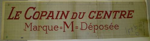 Dessin de mise en carte pour ruban jacquard comportant, en gris, noir, rouge et bleu sur fond blanc, l’inscription sur deux lignes : “LE COPAIN DU CENTRE; Marque=M=Déposée”.