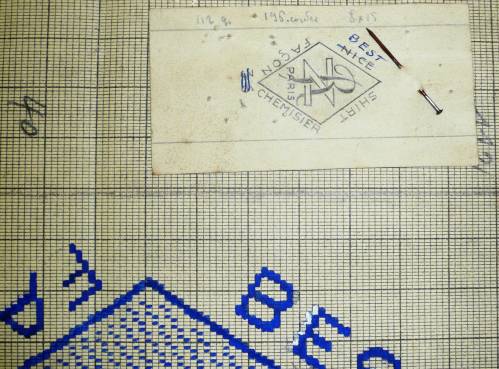 Dessin de mise en carte pour ruban jacquard comportant, en gris, orange et bleu sur fond blanc, l’inscription sur sept lignes dans et autour d’un cartouche en forme de losange : “BEST; SHIRT; FACON; CHEMISIER; R; Z; PARIS”.