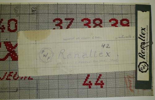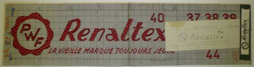 Dessin de mise en carte pour ruban jacquard comportant, en gris, rouge et bleu sur fond blanc, l’inscription sur sept lignes dans et autour d’un cartouche en forme de fleur à corolle : “40 37 38 39; P; W; F; Renaltex 41 42 43; LA VIEILLE MARQUE TOUJOURS JEUNE; 44”.