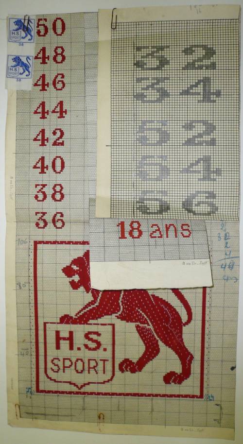 Dessin de mise en carte pour ruban jacquard comportant, en gris, rouge et bleu sur fond blanc, l’inscription sur dix lignes (dont huit relevant des tailles du ruban à tisser) accostant à l’intérieur d’un cartouche carré, l’effigie d’un lion tenant un écusson, vu de profil : “H.S.; SPORT”.