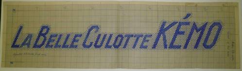 Dessin de mise en carte pour ruban jacquard comportant, en gris et bleu sur fond blanc, l’inscription : “LA BELLE CULOTTE KEMO”.
