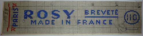 Dessin de mise en carte pour ruban jacquard comportant, en gris, rouge, noir et bleu sur fond blanc, la mention sur quatre lignes “PARIS; ROSY; BREVETE; MADE IN FRANCE; 110”.