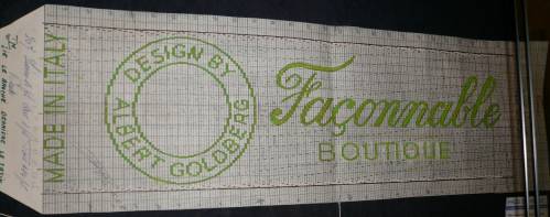 Dessin de mise en carte pour ruban jacquard comportant, en vert, bleu et noir sur fond blanc, inscrites sur quatre lignes dont une incluse dans un double disque, les mentions : “MADE IN ITALY; DESIGN BY ALBERT GOLDBERG; Façonnable; BOUTIQUE”.