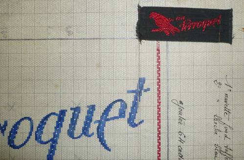 Dessin de mise en carte pour ruban jacquard comportant, en gris, noir, rouge et bleu sur fond blanc, l’inscription sise à la droite d’un logo représentant un perroquet posé sur une branche : “Au Perroquet”.