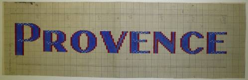 Dessin de mise en carte pour ruban jacquard comportant, en gris, rouge et bleu sur fond blanc, l’inscription : “PROVENCE”.