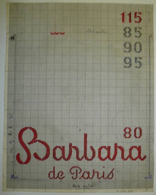 Dessin de mise en carte pour ruban jacquard comportant, en gris, blanc, rouge et bleu sur fond blanc, l’inscription sur deux lignes : “Barbara; de Paris”.