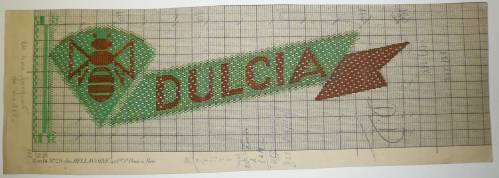 Dessin de mise en carte pour ruban jacquard comportant, en gris, blanc, rouge et vert sur fond blanc, l’inscription “DULCIA” inscrite dans un phylactère précédé d’un motif d’abeille inscrit dans une portion de cercle.