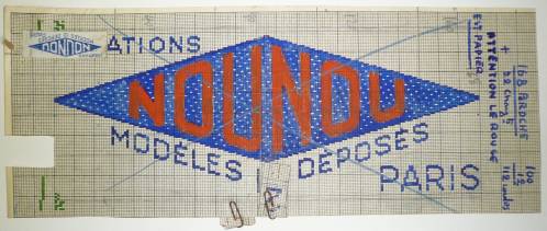 Dessin de mise en carte pour ruban jacquard comportant, en gris, blanc, rouge et bleu sur fond blanc, sur quatre lignes précédées d’un cartouche en forme de losange frappé de la mention “NOUNOU”, les inscriptions : “CREATIONS; MODELES DEPOSES; 12; PARIS”.
