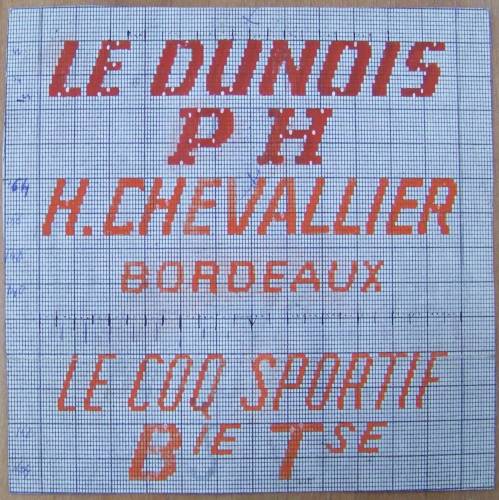 Mise en carte pour ruban jacquard réalisée au crayon rouge et comportant, sur 6 lignes, les inscriptions : “ LE DUNOIS; P H ; H. CHEVALLIER; BORDEAUX; LE COQ SPORTIF; BIE TSE”.
