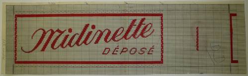 Dessin de mise en carte pour ruban jacquard comportant, en gris, rouge et blanc sur fond blanc, inscrites sur deux lignes comprises dans un cartouche rectanfgulaire, les inscriptions : “Midinette; DEPOSE”.