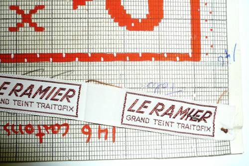 Dessin de mise en carte provenant des Etablissements Derville et Delevoye de Comines (France), renseignant, sur deux lignes à la gouache, à l’encre et au crayon ordinaire, en rouge, gris, bleu et blanc,les caractéristiques d’un ruban intitulé “LE RAMIER; GRAND TEINT TRAITOFIX”, ces mentions étant inscrites dans un cartouche rectangulaire.