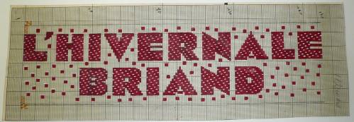 Dessin de mise en carte provenant des Etablissements Derville et Delevoye de Comines (France), renseignant, sur deux lignes à la gouache, à l’encre et au crayon ordinaire, en rouge, gris, orange et blanc, les caractéristiques d’un ruban contenant, inscrites sur deux lignes, les inscriptions : “L’HIVERNALE; BRIAND”.