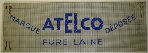 Dessin de mise en carte provenant des Etablissements Derville et Delevoye de Comines (France), renseignant, sur quatre lignes à la gouache, à l’encre et au crayon ordinaire, en gris, bleu, noir et blanc,les caractéristiques d’un ruban intitulé “MARQUE; ATELCO; DEPOSEE; PURE LAINE”.