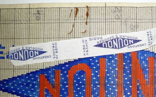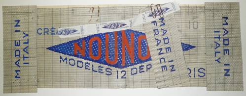 Dessin de mise en carte pour ruban jacquard comportant, en gris, blanc, rouge et bleu sur fond blanc, sur quatre lignes précédées d’un cartouche en forme de losange frappé de la mention “NOUNOU”, les inscriptions : “CREATIONS; MODELES DEPOSES; 12; PARIS”.