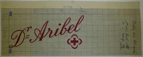 Dessin de mise en carte provenant des Etablissements Derville et Delevoye de Comines (France), renseignant, sur une ligne suivie d’un logo comportant un quadrilobe frappé d’une croix, à la gouache et au crayon ordinaire, en gris, bleu, rouge et blanc, les caractéristiques d’un ruban intitulé “Dr Aribel”.