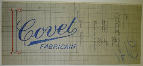 Dessin de mise en carte provenant des Etablissements Derville et Delvoye de Comines (France), renseignant, sur deux lignes, à la gouache, à l’encre et au crayon ordinaire, en gris, rouge, bleu, noir et blanc, les caractéristiques d’un ruban intitulé “Covet; FABRICANT”.