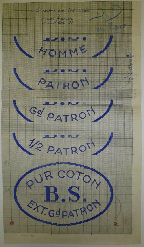 Dessin de mise en carte provenant des Etablissements Derville et Delvoye de Comines (France), renseignant, sur trois lignes inscrites dans un cartouche ovale, à la gouache, à l’encre et au crayon ordinaire, en gris, rouge, bleu et blanc, les caractéristiques d’un ruban intitulé “PUR COTON; B.S.; EXT. Gd PATRON”.