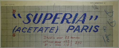 Dessin de mise en carte provenant des Etablissements Derville et Delvoye de Comines (France), renseignant, sur deux lignes, à la gouache et au crayon ordinaire, en gris, bleu, rouge et blanc, les caractéristiques d’un ruban intitulé “”SUPERIA”, (ACETATE) PARIS”.