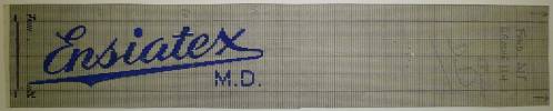 Dessin de mise en carte provenant des Etablissements Derville et Delvoye de Comines (France), renseignant, sur deux lignes, à la gouache et au crayon ordinaire, en gris, bleu, rouge, noir et blanc, les caractéristiques d’un ruban intitulé “Ensiatex; M.D.”.