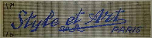 Dessin de mise en carte provenant des Etablissements Derville et Delvoye de Comines (France), renseignant, sur deux lignes, à la gouache et au crayon ordinaire, en gris, bleu, rouge, noir et blanc, les caractéristiques d’un ruban intitulé “Style et Art; PARIS”.
