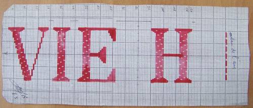 Mise en carte pour ruban jacquard comportant, au crayon rouge, les inscriptions : “VIE H”.