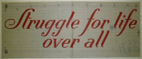 Dessin de mise en carte provenant des Etablissements Derville et Delvoye de Comines (France), renseignant, sur deux lignes, à la gouache et au crayon ordinaire, en gris, rouge, noir, bleu et blanc, les caractéristiques d’un ruban intitulé “Struggle for life; over all”.