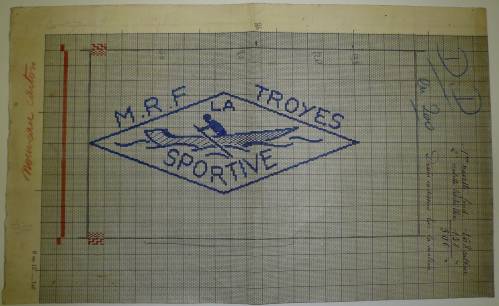 Dessin de mise en carte provenant des Etablissements Derville et Delvoye de Comines (France), renseignant, sur trois lignes, à la gouache et au crayon ordinaire, en gris, rouge, noir, bleu et blanc, les caractéristiques d’un ruban intitulé “M.R.F. TROYES; LA; SPORTIVE”, ces deux dernières lignes étant incluses dans un cartouche à forme de losange frappé d’un motif représentant un rameur en plein effort.