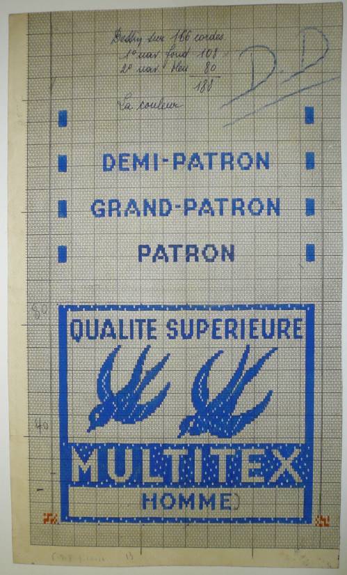 Dessin de mise en carte provenant des Etablissements Derville et Delvoye de Comines (France), renseignant, sur six lignes, à la gouache et au crayon ordinaire, en gris, rouge, bleu, noir et blanc, les caractéristiques d’un ruban intitulé “DEMI-PATRON; GRAND-PATRON; PATRON; QUALITE SUPERIEURE; MULTITEX; HOMME”, ces trois dernières lignes étant incluses dans un cartouche à forme de carré frappé d’un motif représentant deux hirondelles.