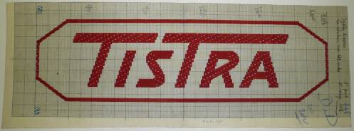 Dessin de mise en carte pour ruban jacquard issu de l’usine Dervile et Delvoye (Comines-France) comportant, en gris, rouge, noir et bleu sur fond blanc, l’inscription “TISTRA” entourée d’un cartouche polygonal.