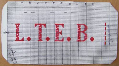 Mise en carte pour ruban jacquard réalisée au crayon rouge et portant les inscriptions : “L.T.E.B.”