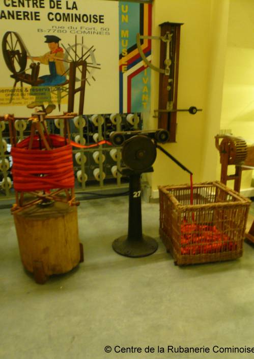 Dévidoir avec galuenne et panier destiné à dévider le ruban à son retour de la teinturerie.