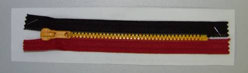 Fermeture à glissière tricolore injectée aux couleurs de la Belgique, réalisée gracieusement par les établissements Eclair Prym à la demande du Musée de la Rubanerie, en commémoration des 175 ans de la Belgique.