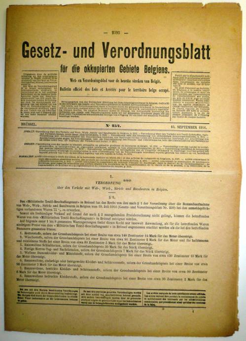 Journal numéro 252 du Bulletin officiel des Lois et Arrêtés pour le territoire belge occupé, n°252 du 10 septembre 1916, comportant notamment l’Arrêté concernant le trafic des tissus, de la bonneterie (articles de tricot, etc.) et des articles de rubanerie en Belgique.