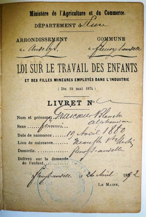 Livret d’apprenti comportant la loi sur le travail des enfants et des filles mineures employés dans l’industrie des 25 novembre 1872, 10 février 1873 et 19 mai 1874, promulguée au Journal officiel du 3 juin 1874, suivie de eux feuillets reprenant les états de service du possesseur