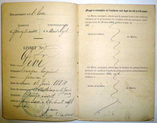 Livret de travail d’enfant avec instructions relatives à sa délivrance, sept feuillets faisant état des prestations de son possesseur, suivis de la loi du 2 novembre 1892 sur le travail des enfants, des filles mineures et des femmes dans les établissements industriels.