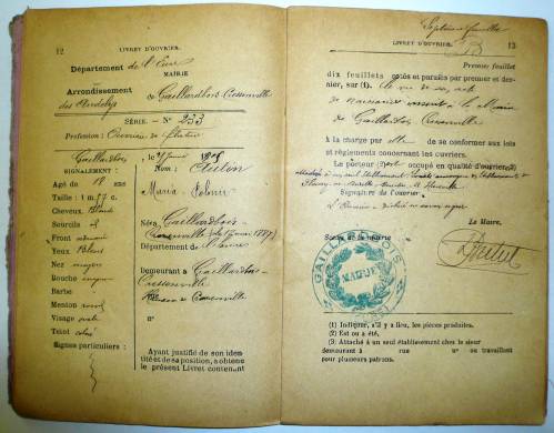 Livret d’ouvrier comportant la loi sur les livrets d’ouvriers des deux sexes du 22 juin 1854 (promulguée le 26 juin 1854), le décret du 30 avril 1855, la loi qui modifie l’arrêté du 9 frimaire an XII, en ce qui concerne les avances des ouvriers des 25 avril, 8 et 14 mai 1851, un extrait de la loi du 9 avril 1898 concernant les responsabilités des accidents dont les ouvriers sont victimes dans leur travail; deux feuillets relatifs aux signes distinctifs du possesseur du livret et deux feuillets reprenant les états de service du possesseur.