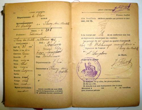 Livret d’ouvrier comportant la loi sur les livrets d’ouvriers des deux sexes du 22 juin 1854 (promulguée le 26 juin 1854), le décret du 30 avril 1855, la loi qui modifie l’arrêté du 9 frimaire an XII, en ce qui concerne les avances des ouvriers des 25 avril, 8 et 14 mai 1851, un extrait de la loi du 9 avril 1898 concernant les responsabilités des accidents dont les ouvriers sont victimes dans leur travail; deux feuillets relatifs aux signes distinctifs du possesseur du livret et un feuillet reprenant les états de service du possesseur.