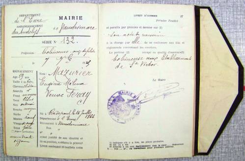 Livret d’ouvrier délivré par le Maire, comportant des feuillets à remplir par les patrons à l’entrée et à la sortie de l’atelier.