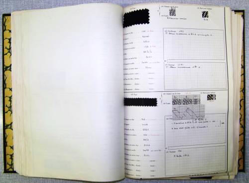 Recueil d’échantillons textiles avec mentions manuscrites, comportant, sur la couverture, l amention “F.GUILLOT.” inscrite à l’encre sur un petit morceau de papier carton.