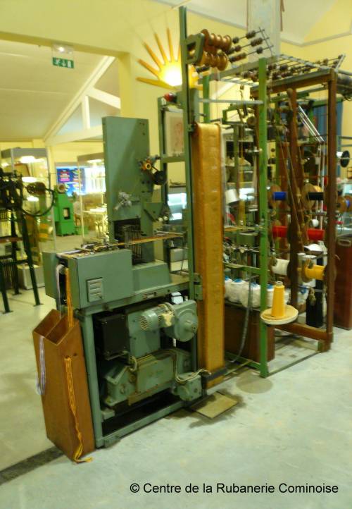Métier à aiguilles 2 bandes avec lecture par carton perforé "Mutronic". Ce procédé permet de tisser des rubans avec un très long rapport de duites. Le métier tisse un ruban élastique avec l’inscription “MUSÉE DE LA RUBANERIE COMINOISE”.